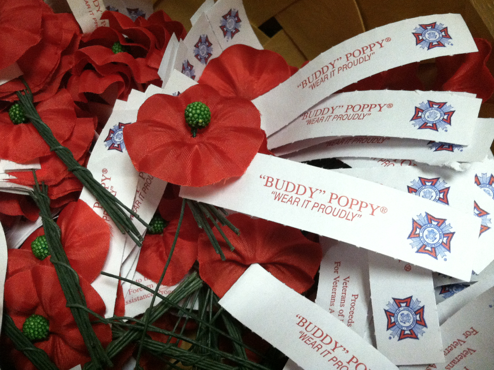 From 1919 until 1922, the red poppy was used by many countries as a fundraiser for veterans. In 1923 The Veterans of Foreign Wars agreed American Veterans of the Great War could also benefit from making and selling the red Memorial Poppy. In February 1924, the name “BUDDY POPPY” was registered as a U.S. Patent.   In May 1924, a certificate was issued to grant trademark rights to the Veterans of Foreign Wars for the manufacture of genuine “Buddy Poppies”. Since that time, members of the Veterans of Foreign Wars have distributed Buddy Poppies, usually on Armistice Day, now known as Memorial Day in May and on Veterans Day in November.